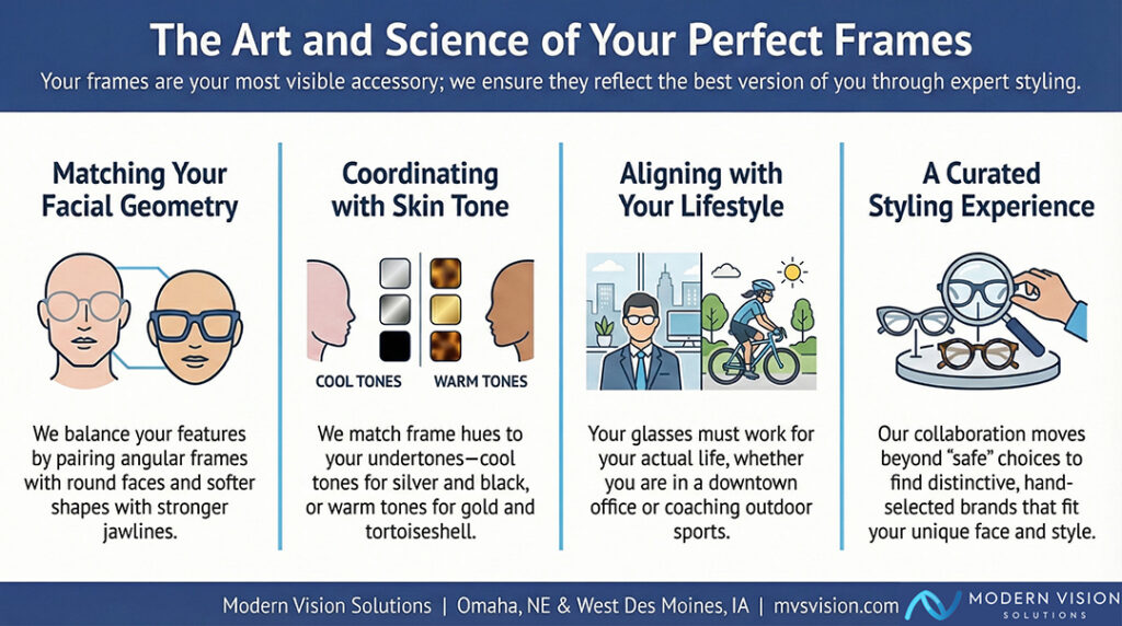 Most people spend more time choosing a pair of shoes than they do choosing glasses — even though glasses are on your face every single day. At Modern Vision Solutions, we help make selecting the right glasses easy. This article explains how our Omaha team helps you find frames that fit your face, your lifestyle, and personality.
